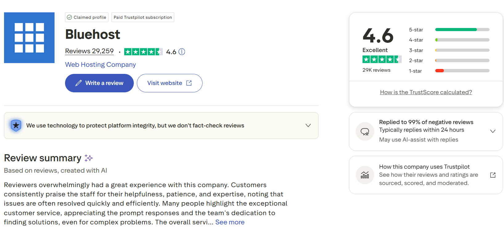 Bluehost web hosting reviews: Bluehost holds a strong 4.6 out of 5 rating, placing it among the best-rated web hosting providers in 2026. Since Trustpilot does not allow companies to pay to hide negative reviews, this score reflects genuine user feedback over time.