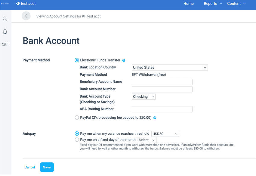 Select Balance“0.00”>Bank Account in the top nav menu. You must set up two-factor authentication to access these settings. Next to Payment Method, select how you want to be paid – PayPal or Electronic Funds Transfer.