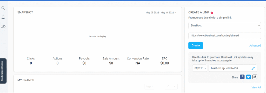 After you’ve been accepted into the Bluehost Affiliate Program, you can find your tracking link by going to your Impact Radius dashboard and copying the link in the Create a Link box.