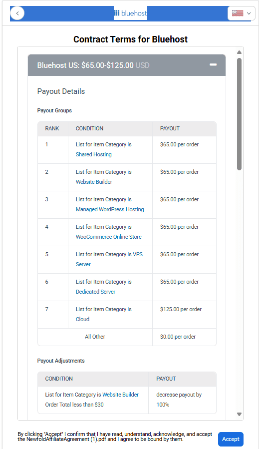 3. Please read and understand the terms and conditions before clicking the Accept button on the Contract Terms for Bluehost page.