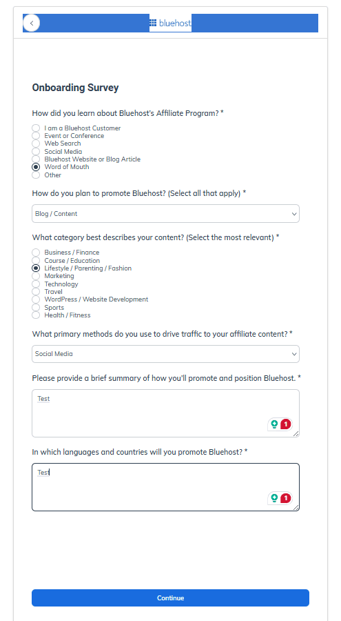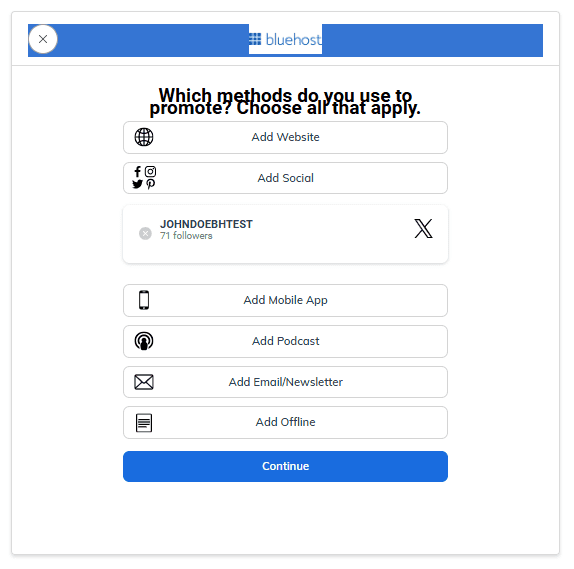 8. Please choose all the ways you’d like to promote your business with Bluehost, then click Continue to proceed.
