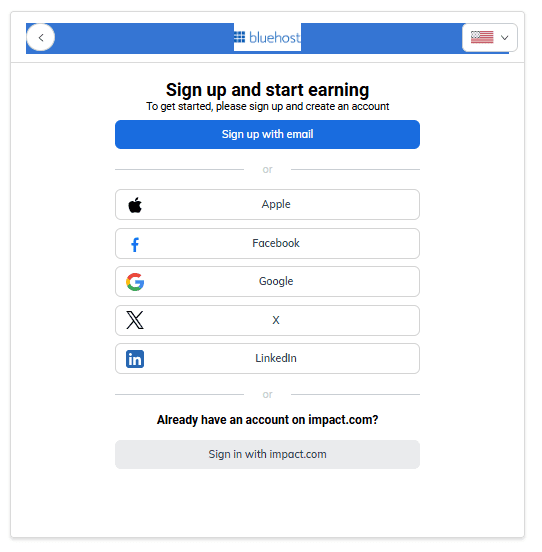For existing account – If you already have an account created in Impact, go to the Bluehost Partner Program Login page, then click the Sign in button to access your existing Impact Radius account.