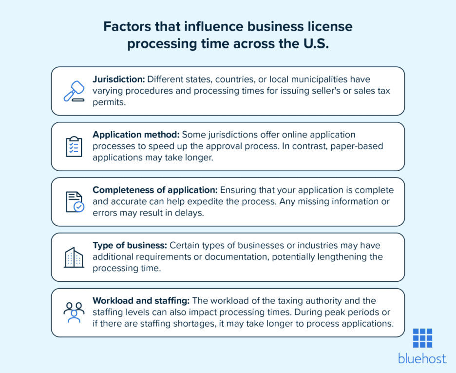 Seller’s or sales tax permit processing times differ depending on the application procedure and location (state or municipality). Licensing time is also influenced by workload, business type, jurisdictional procedures and the thoroughness of the application.
