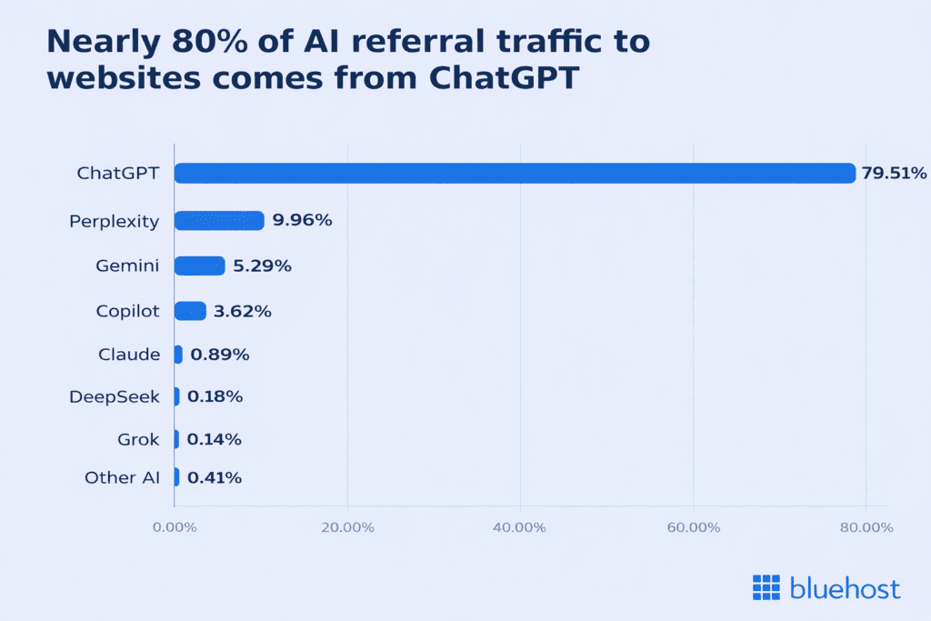 And within that growing slice of web traffic, ChatGPT is not just in first place. It is overwhelmingly dominant, driving nearly 80% of AI traffic to websites.