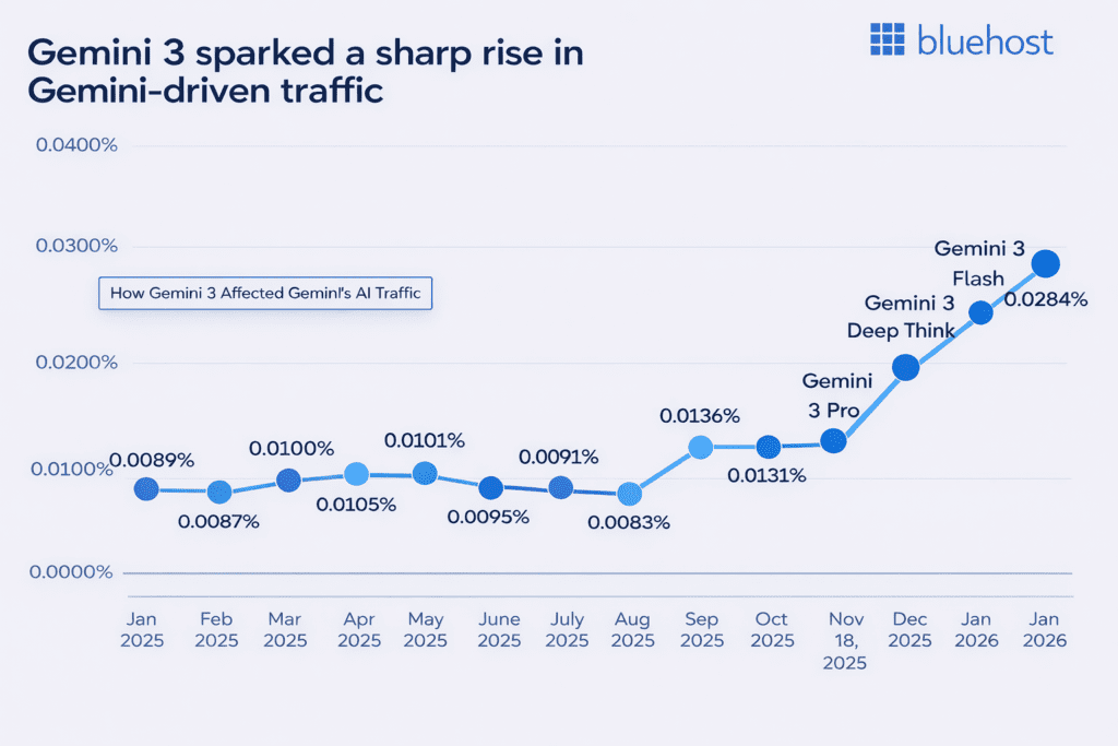 Once Gemini 3 Flash became the default across Google’s AI surfaces, the line broke sharply upward and traffic more than doubled in two months. That pattern points to something bigger than a normal product bump.