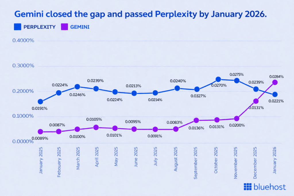 As we go deeper into the research, we see that by January 2026, Gemini hit another milestone: for the first time, it surpassed Perplexity in global AI traffic.