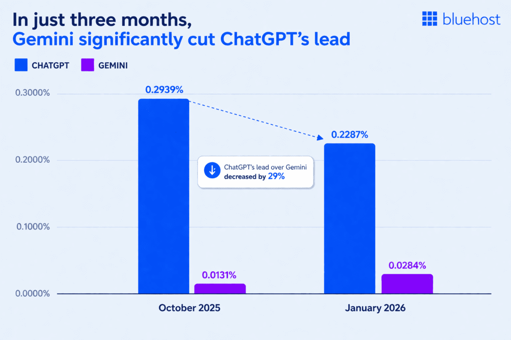 Between October 2025 and January 2026, the gap narrowed by 29% not because ChatGPT suddenly lost relevance, but because Gemini started growing fast enough to change the shape of the race.