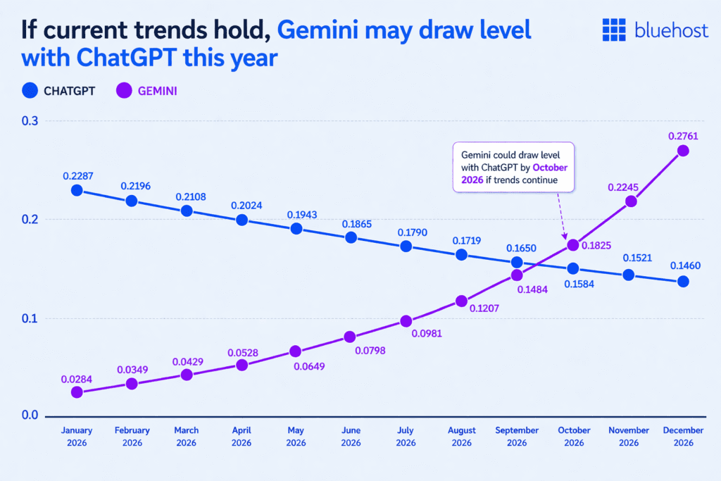 If the recent trends continue, there is a possibility that Gemini could catch ChatGPT by October 2026
