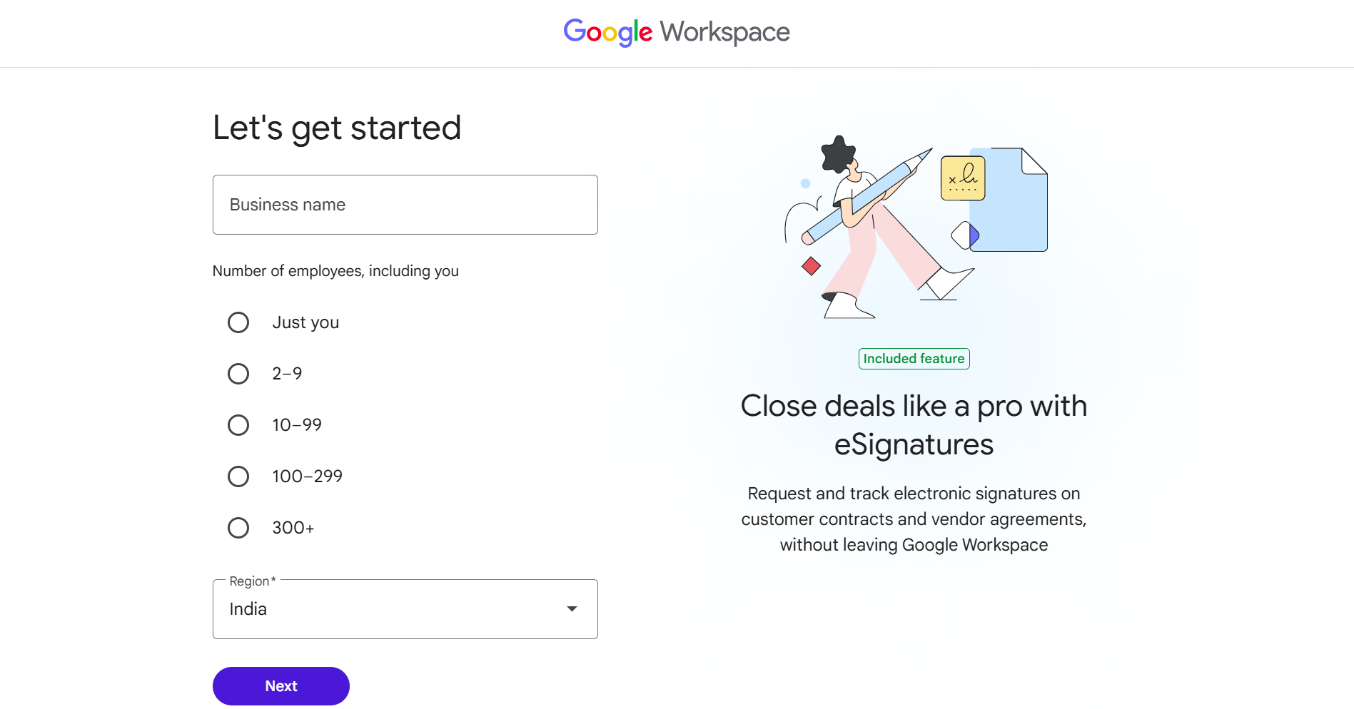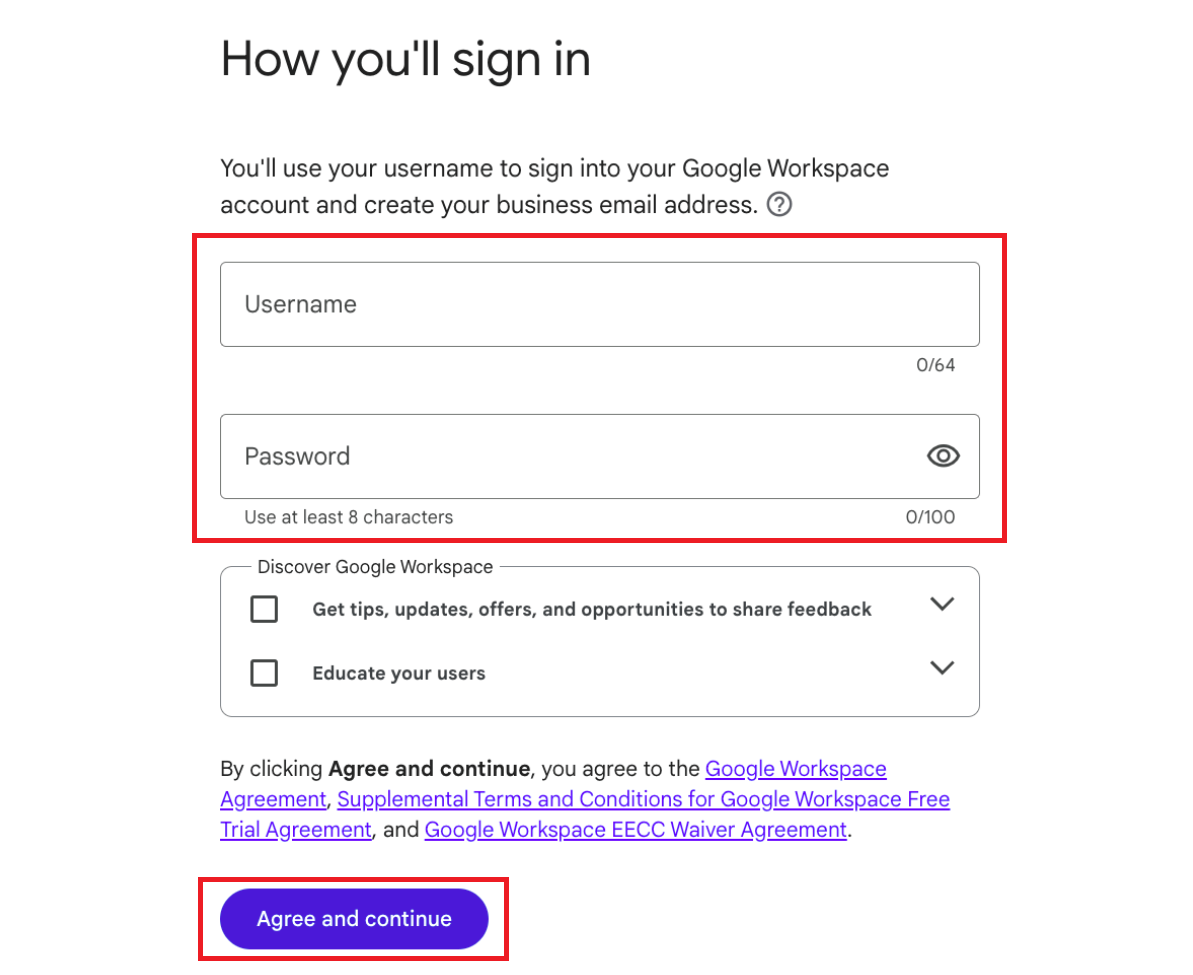 - Start by signing up for Google Workspace and entering your business details.