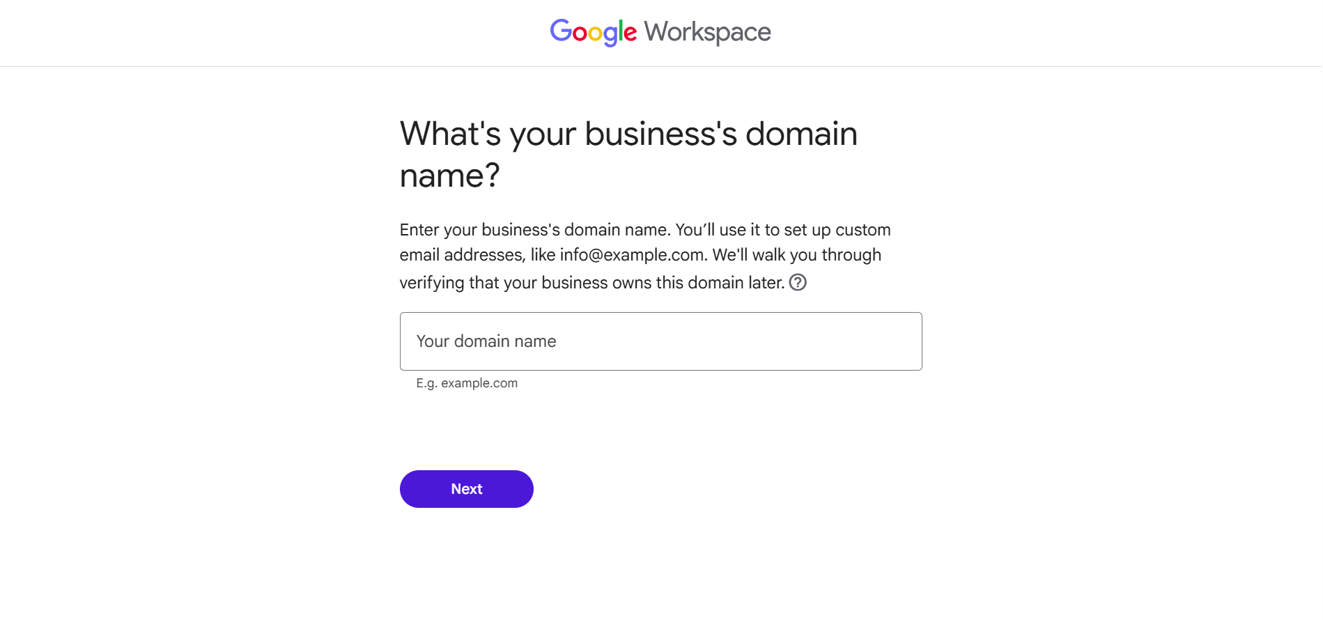 Once those details are sorted, the next thing to think about is your domain name. This domain will be used for your business email address, such as you@[yourcompany.com]. If you already own a domain, you’ll connect it during setup. If not, Google lets you purchase one, but deciding in advance keeps the process moving without interruption.