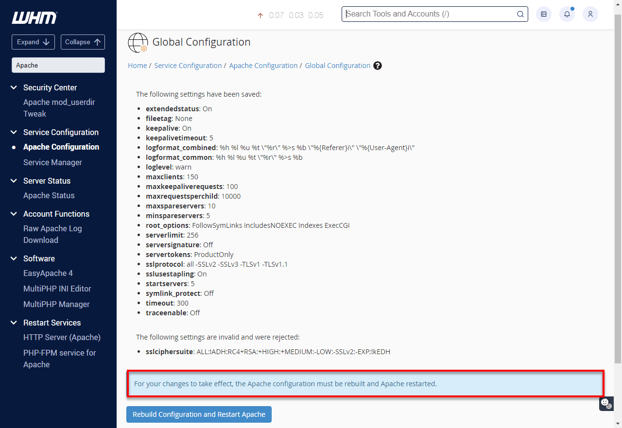 Next, click Rebuild Configuration and Restart Apache to apply the changes.