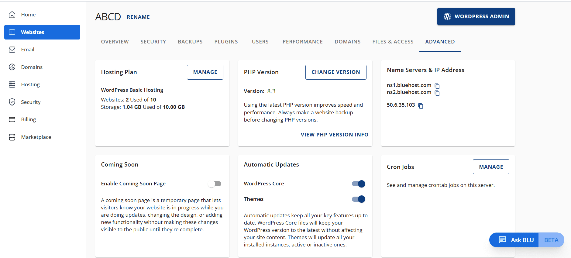 Go to Bluehost Account Manager → Websites → Advanced → Automatic Updates to verify auto-updates are enabled.