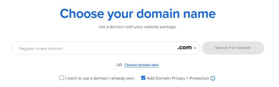 - On the domain selection page, enter your new or existing domain name. You can also opt to choose your domain later.