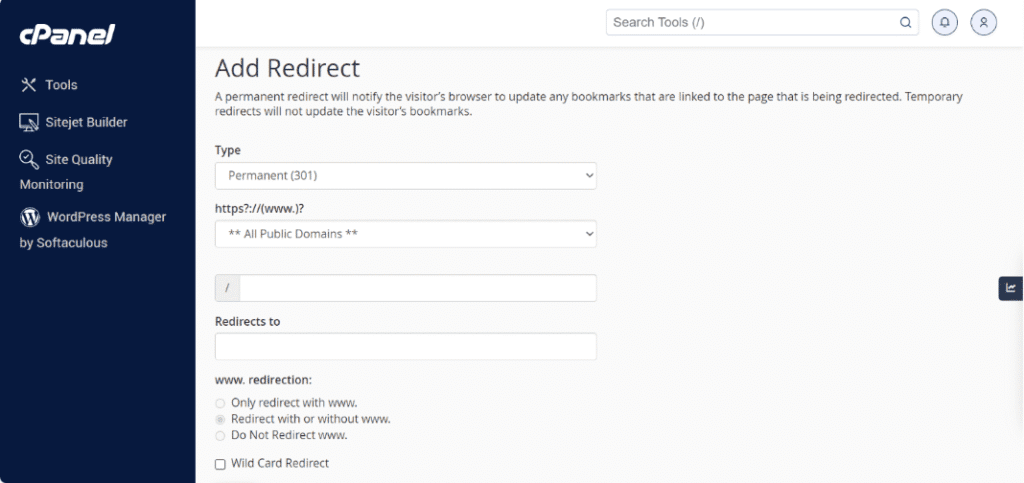 - Redirect with or without www. – Redirects all users, regardless of whether they enter the www. prefix before the domain name.