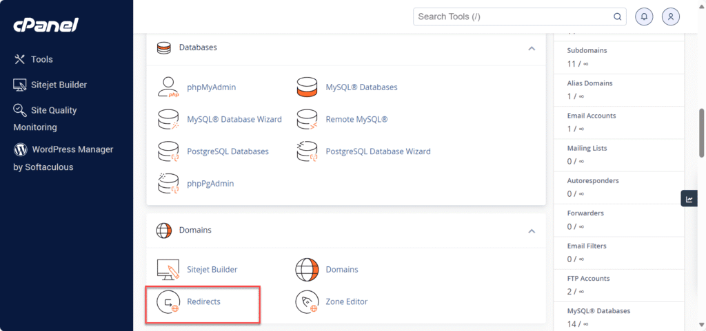 4. Scroll down to the Domains section and click on the Redirects icon.