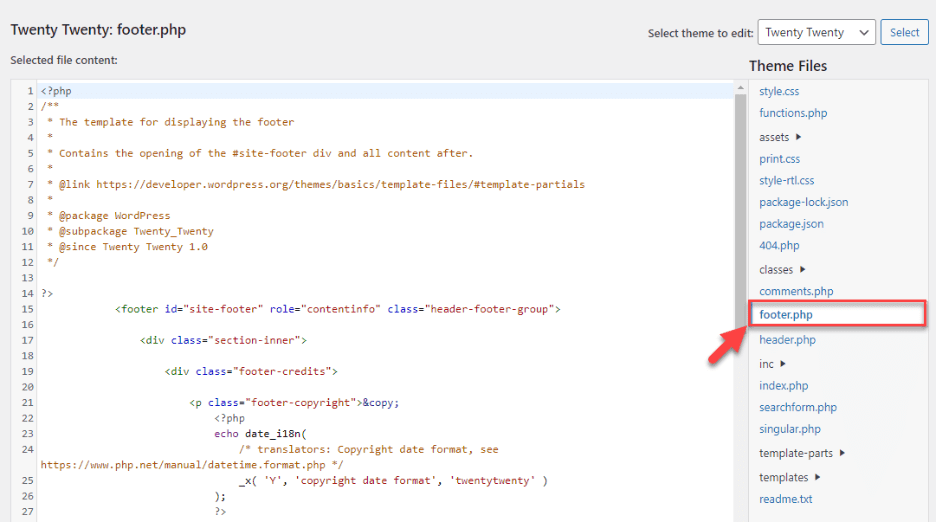 - On the right-hand side, under Theme Files, locate and click on footer.php.