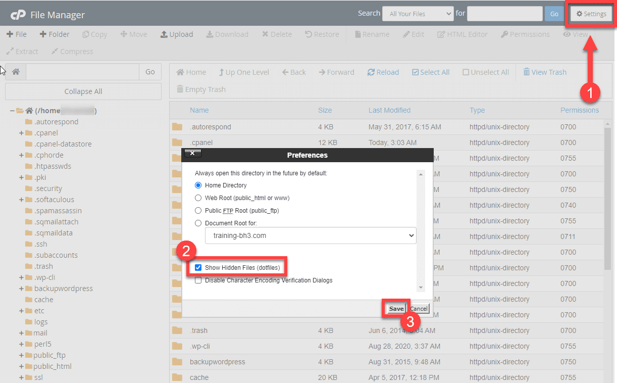 4. Click the Settings button at the top right corner. Make sure that there is a check mark on Show Hidden Files (dotfiles), then hit Save.
