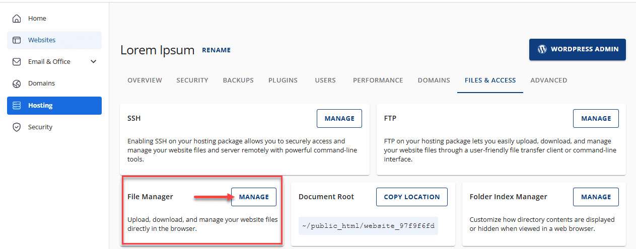 2. Go to the FILES & ACCESS tab and click MANAGE on the File Manager tile.