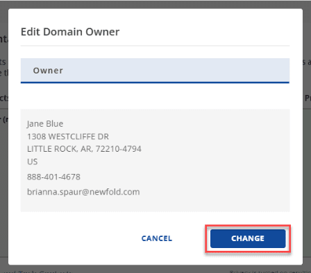 5. To change the Domain Owner details, click the EDIT button. Once the pop-up menu appears, click the CHANGE button.