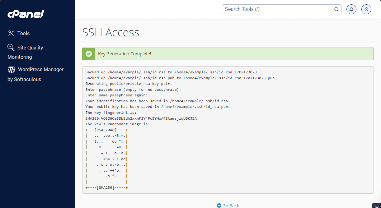 Then, the key is created and Bluehost displays the key location and fingerprint.