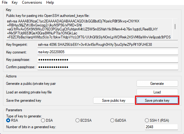 Before saving your private key, consider adding a passphrase for additional security. Click in the “Key passphrase” field and enter a strong, memorable phrase. This passphrase encrypts your private key, so even if someone gains access to your PPK file, they cannot use it without the passphrase.