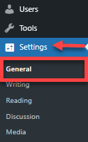 - Log in to your WordPress Dashboard and click Settings on the left menu, then select General.