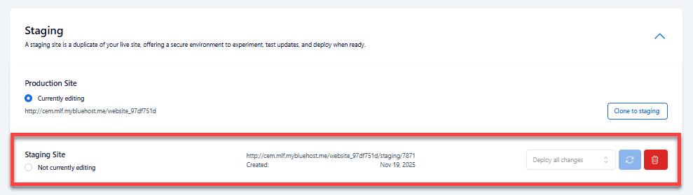 If you’re a Bluehost user, you can create a staging site directly from your dashboard – no manual configuration required.