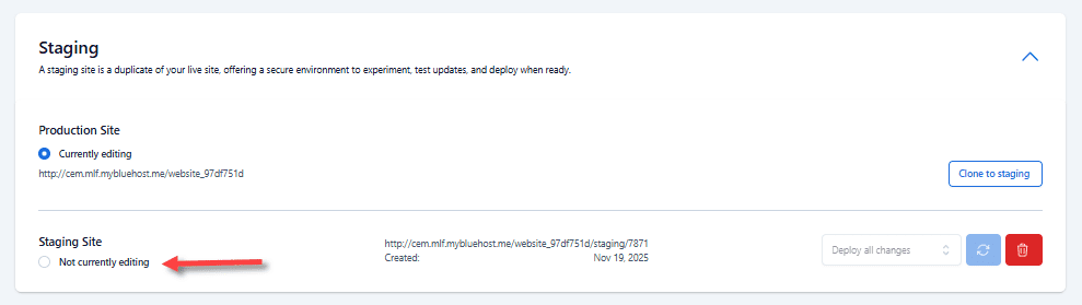 - Select the ‘Not currently editing’ option under the ‘Staging Site’ section to switch to the staging environment.
