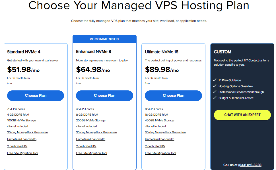 For crypto trading bots, a self-managed VPS with dedicated resources, full control, strong security, scalability and reliable network performance is ideal. Bluehost offers plans tailored for power users, providing the flexibility and performance needed to run your bots effectively.