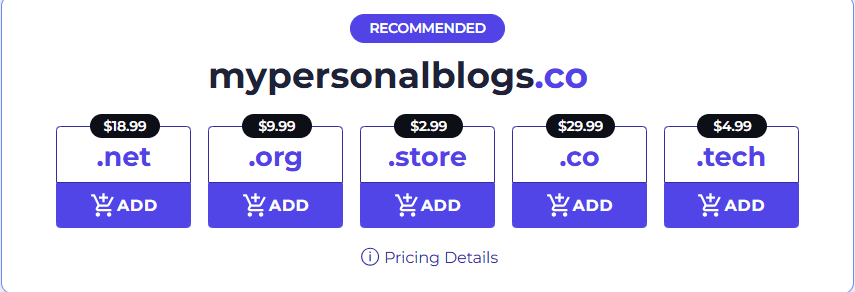 - If the domain is unavailable, the Cart will suggest similar available domains. Click Add to Cart to select one of these alternatives.