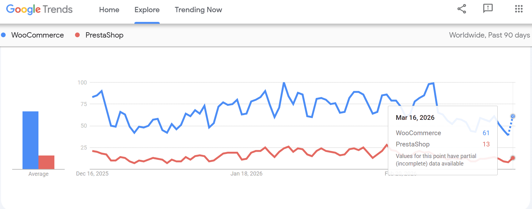 According to Google Trends, WooCommerce’s search popularity is increasing rapidly, reflecting growing interest. However, it’s important not to base your decision solely on trends.