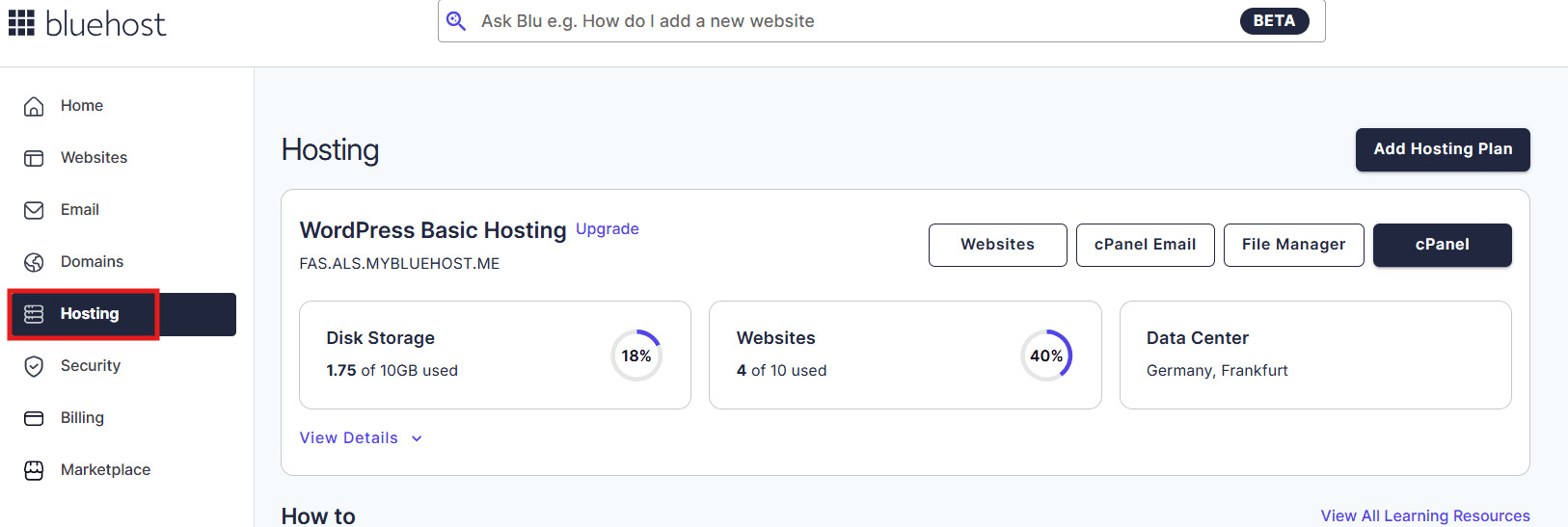 - Open Bluehost dashboard and click on hosting.