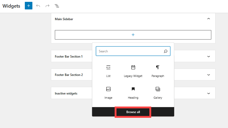 2. Click the block “+” icon where you want to add the menu (for example: Main sidebar or footer bar).