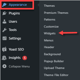 1. Within the WordPress dashboard, click Appearance in the left-side menu, then select Widgets.