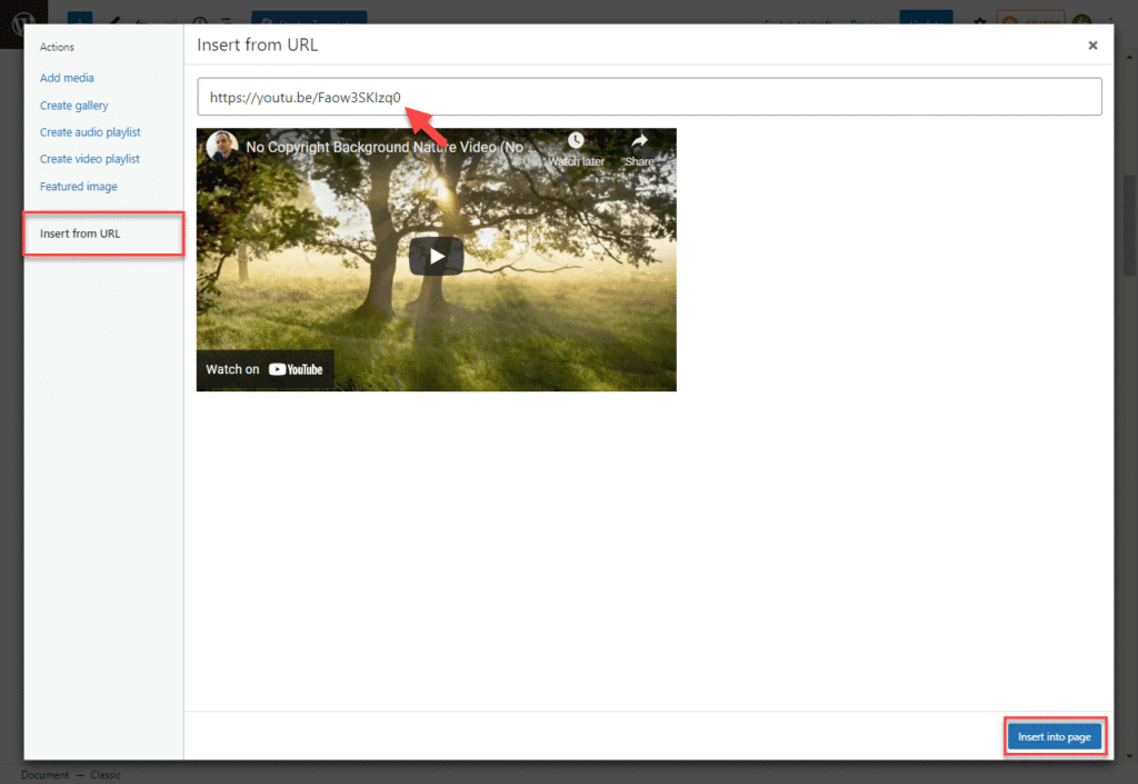 4. Under Actions, select Insert from the URL. Then, from there, paste the URL of the video. Click Insert into Page to add.