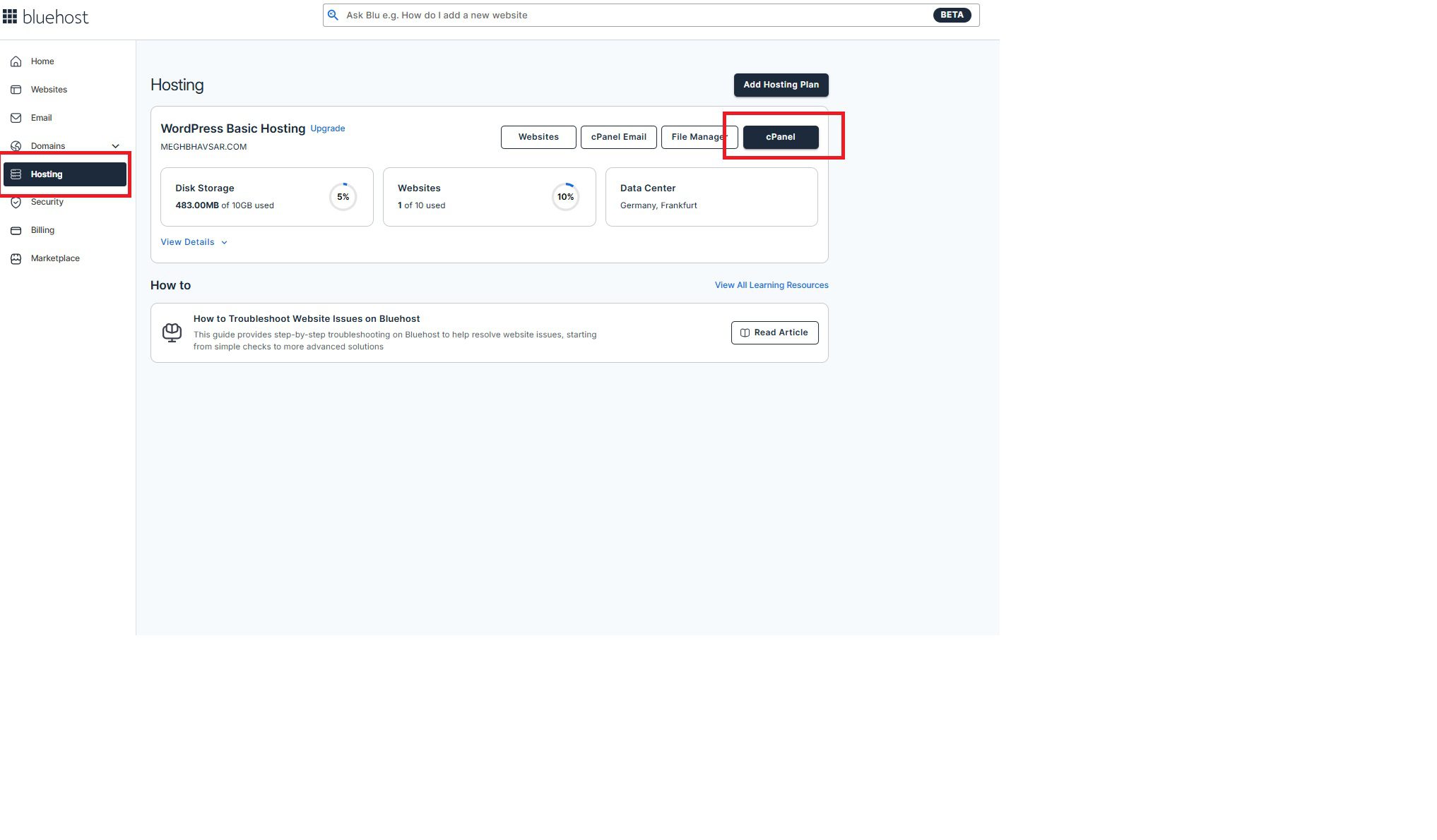 2. Click “Hosting” in the left-hand menu, then click the “cPanel” button on your hosting details page.
