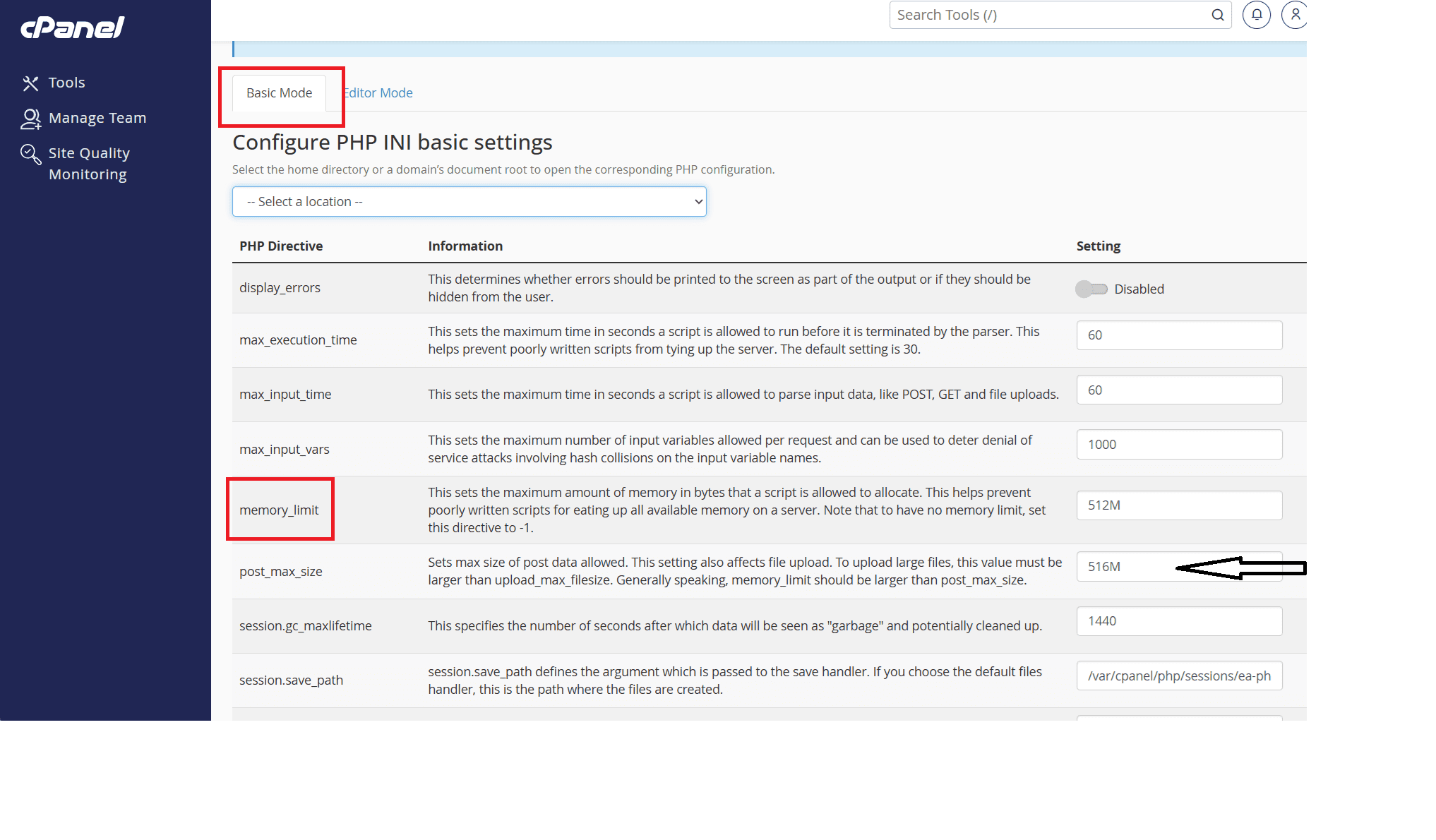 5. Under “Basic Mode,” find the “memory_limit” setting, verify or enter your desired value (e.g., 256M).
