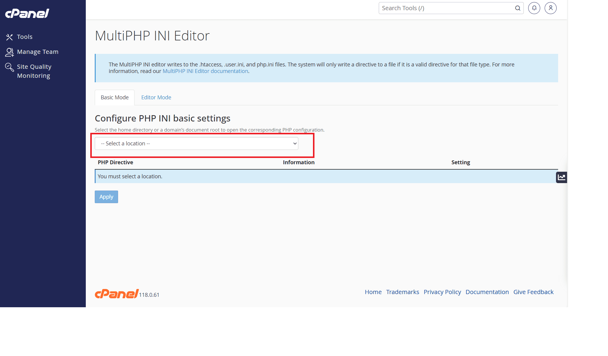 4. From the “Select a location” dropdown, choose the domain or home directory you want to update.