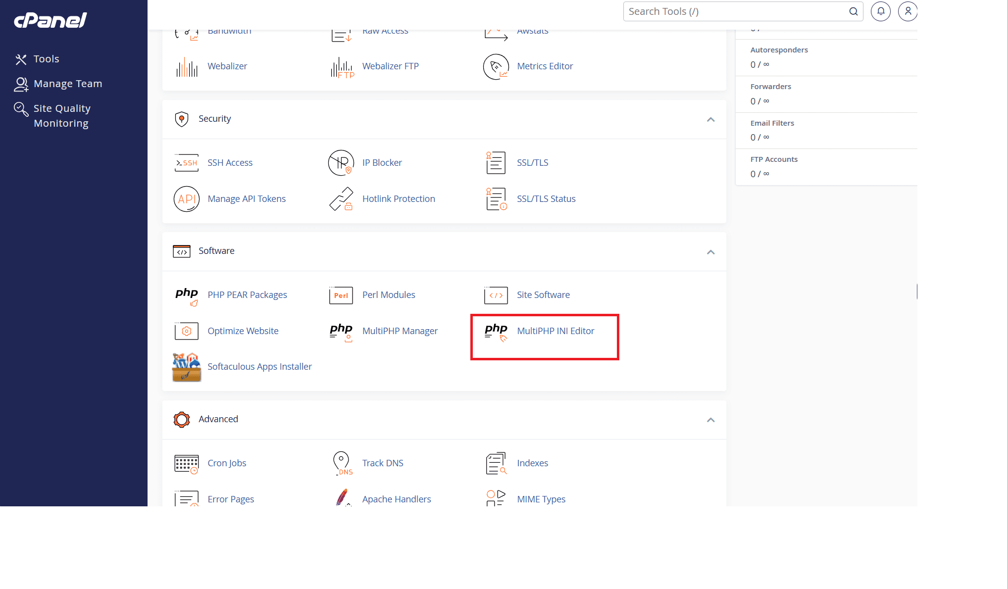 3. In cPanel, scroll to the “Software” section and click on “MultiPHP INI Editor.”
