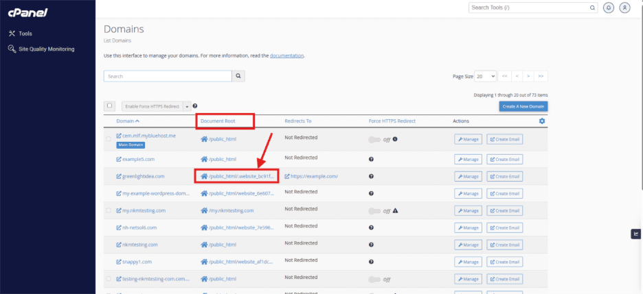 - File Manager opens, showing your website files and folders. Navigate to the confirmed document root to access your WordPress dashboard files, including the wp admin directory, plugins and configuration files like .htaccess.