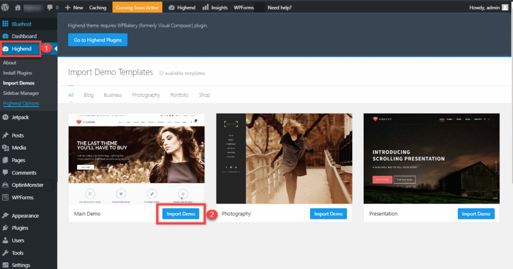 The first option is straightforward and will work if your theme offers this functionality. Always remember that the process can differ based on your chosen theme, but generally follows similar steps. We’ll use the Highend Multipurpose WordPress theme for this demo because it features one-click demo imports from the theme dashboard.