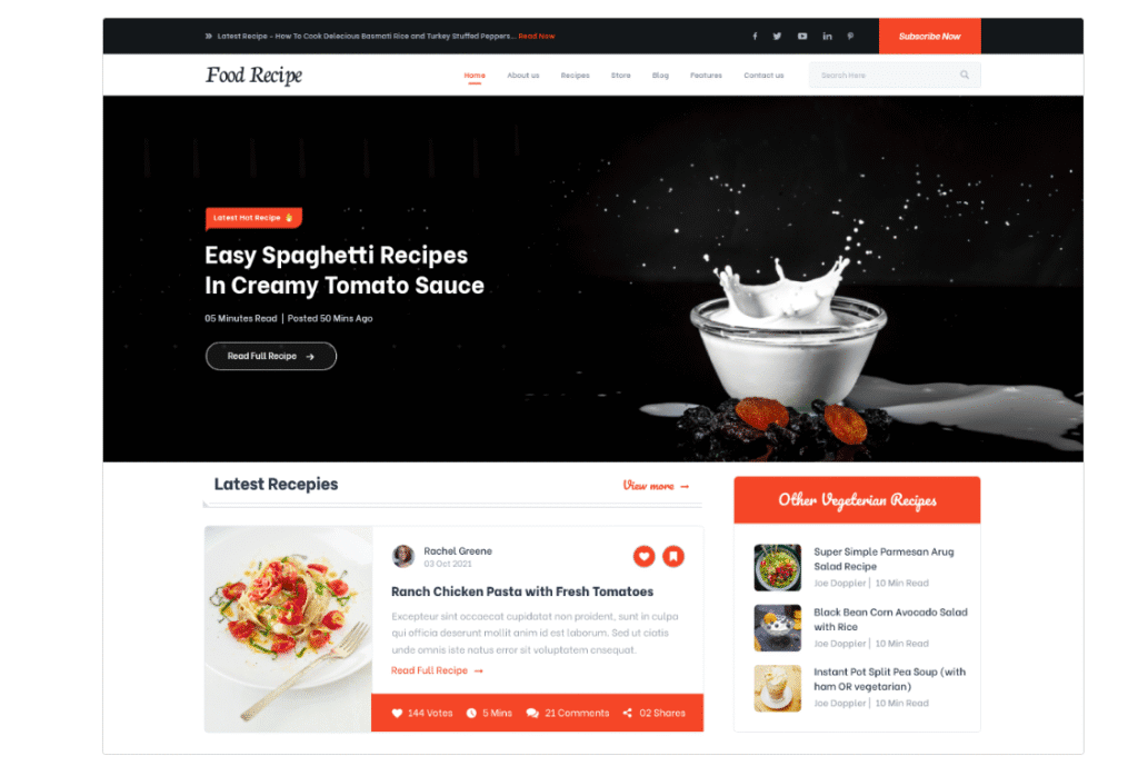 With many readymade designs, including one for a food/recipe website, Pepper+ is an all-purpose WordPress theme. It has a modular design with recipe blog template that you may arrange in different ways by dragging and dropping them.