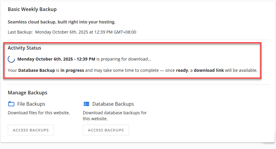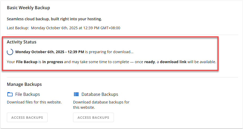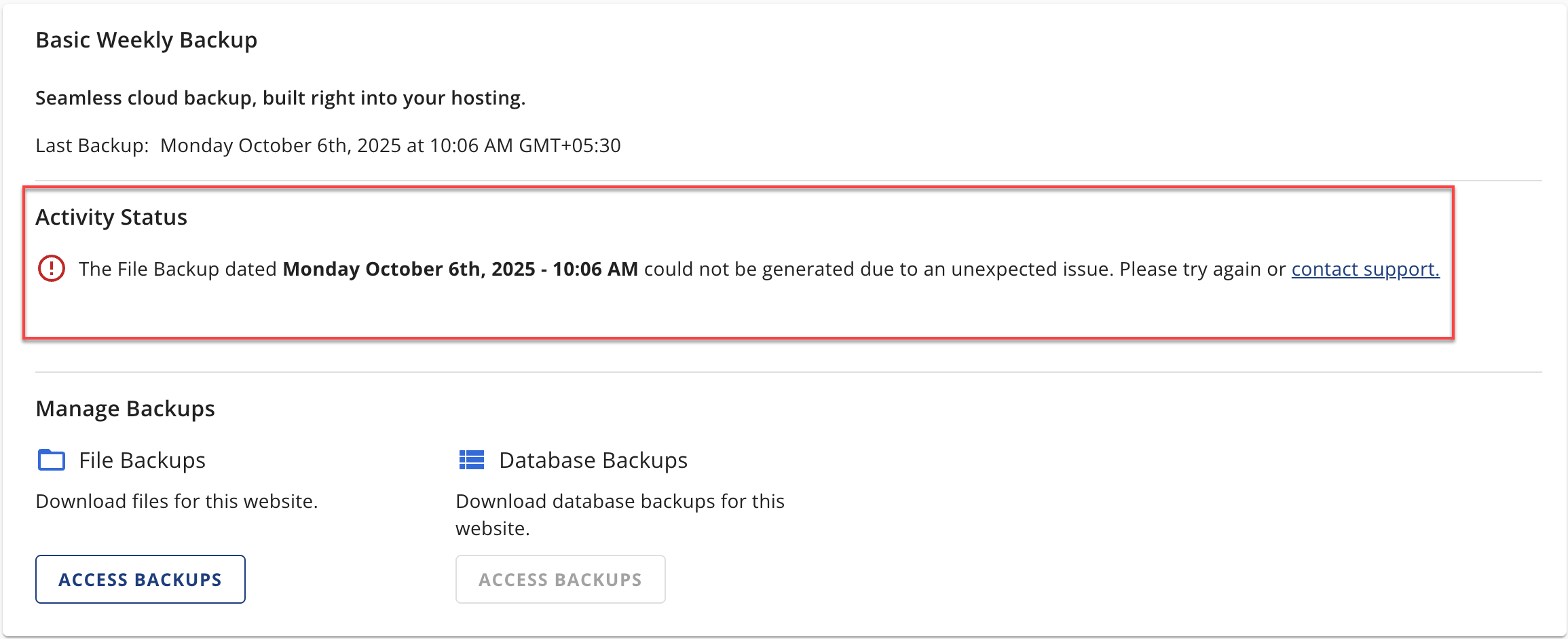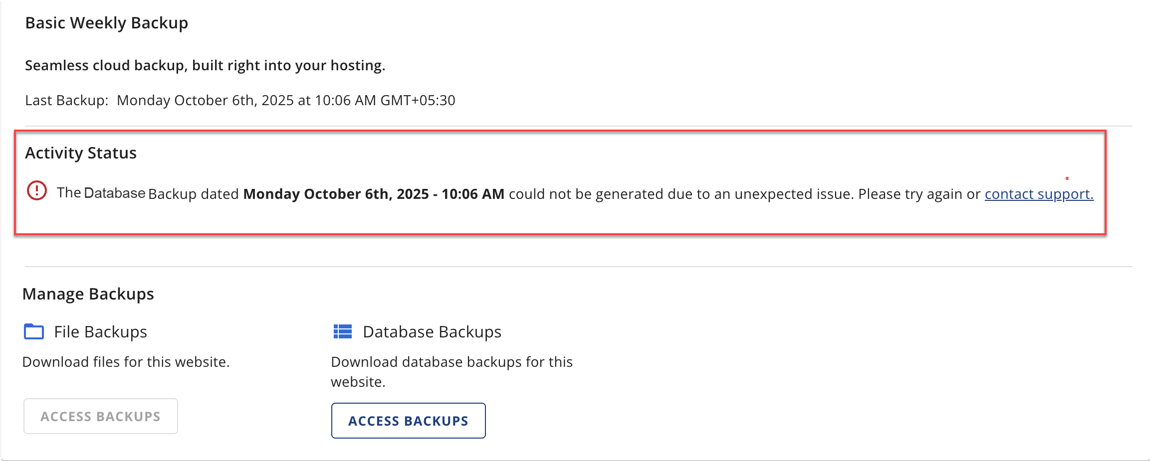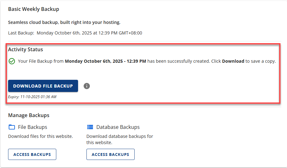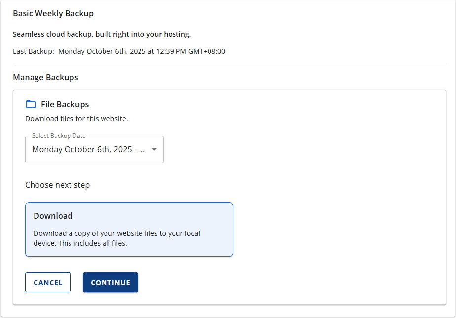 A backup of a Primary Site will have a tooltip beside the downloadable link. Due to a cPanel folder structure limitation, backing up your primary site will automatically include data from all your addon sites. It is recommended that you extract and restore only the files necessary for the primary site after downloading the backup. - If the download fails, you will see an error message in the Manage Backups section indicating the failure.
