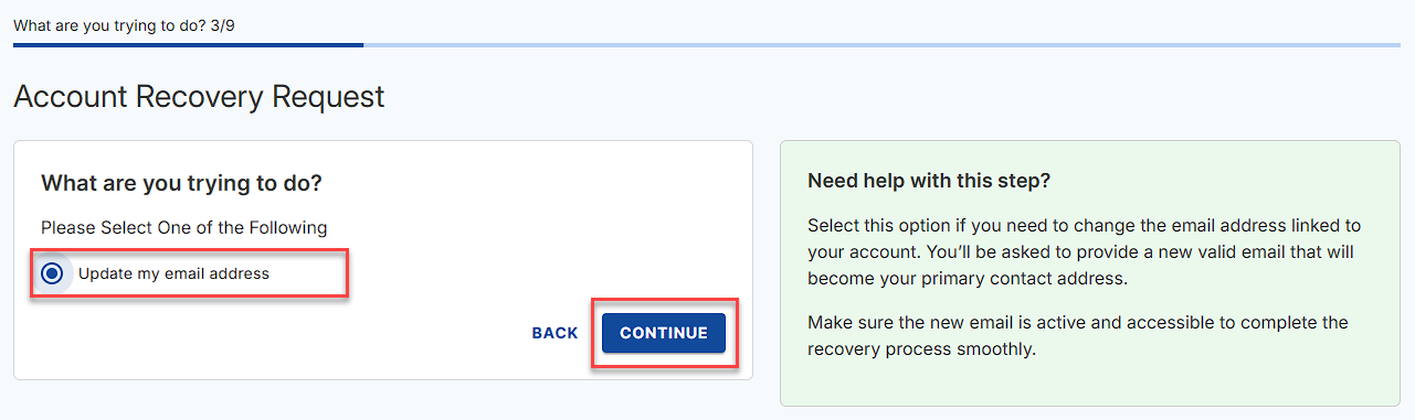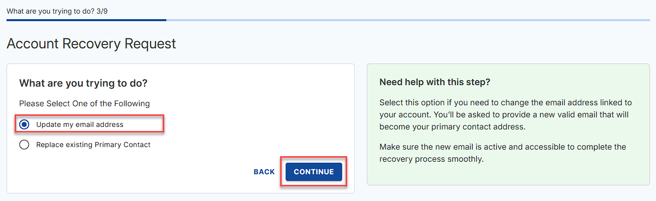 The roles displayed on this step may depend on the available User/Roles added to the account. - Select Update my email address and click CONTINUE.